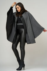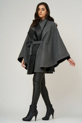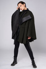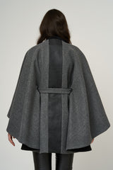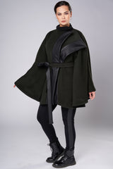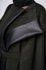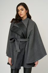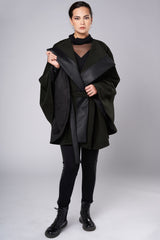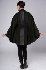 Superbe Cape élégante en laine doublée. Empiècements linéaires en cuir vegan stylé et ceinture à la taille, pouvant être portée de plusieurs façons. Style unique.