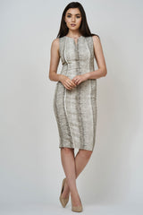 Robe chic, moulante et distinguée avec imprimé géométrique à inspiration animale. Passepoil vertical et asymétrique flatteur pour la silhouette.Tissu très extensible et confortable. Fermeture à glissière invisible au dos.