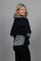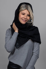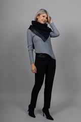 Foulard en laine - capuche doublé, confortable et chaud. Réversible et peut se porter de multiples façons pour des looks stylés. Bandes contrastantes en cuir vegan et bouton en cuir vegan.