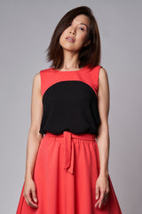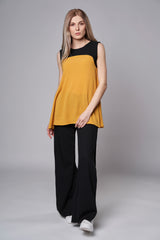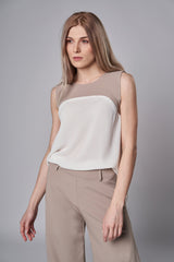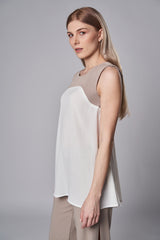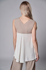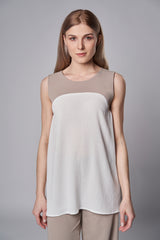 Haut vaporeux sans manches. Couple ample et fluide avantageant tous les types de silhouettes. Tissu SUPER doux et léger et avec certification OEKO-TEX®. Découpe arrondi et contrastante pour un look distingué et à la fois décontracté.