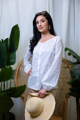 Cette blouse chemisier 100 % coton séduit par sa douceur et sa légèreté naturelle. Dotée de jolis boutons et de manches subtilement bouffantes et froncées à l'encolure, elle offre une silhouette délicatement structurée. Son encolure modulable permet de la porter de plusieurs façons : épaules dégagées pour un look bohème chic, ou bien couvrantes pour une allure plus classique.