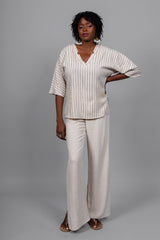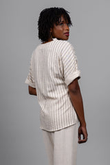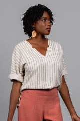 La blouse en Lin Maya est formidable pour la saison d'été. Son imprimé linéaire apporte une touche stylée à toutes vos tenues. Polyvalente et confortable, elle peut être portée à la fois de manière décontractée ou élégante. Parfait pour les chaudes journées estivales.