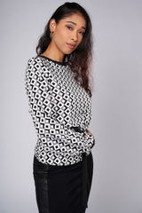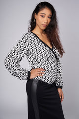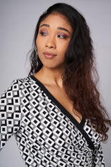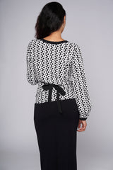 Blouse nouée et réversible aux manches semi-bouffantes. Coupe permettant d'interchanger le devant et le dos permettant une encolure en V ou en rond. Le tissu SUPER doux et léger a la certification OEKO-TEX®. L'ampleur séduisante et l'imprimé contrastant complimente la silhouette.