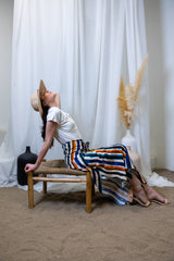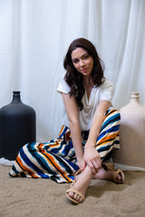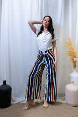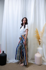 Son imprimé à rayures verticales allonge visuellement la jambe, tandis que sa taille ajustable, grâce à un système de boutons et de bandes à nouer, vous permet un ajustement parfait.
