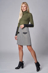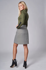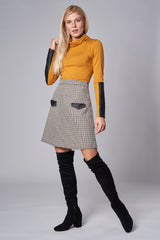 Jolie jupe taille haute en motif de pied de poule. Coupe A avantageant tous les types de silhouette. Petits rabats contrastant en cuir vegan.