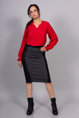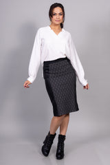 Jolie jupe extensible avantageant la silhouette grâce à sa taille haute et aux empiècements verticaux en cuir vegan. Imprimé géométrique moderne pour un look raffiné.