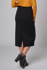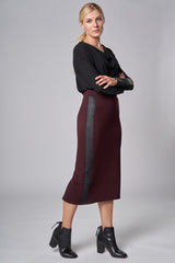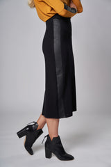 Jolie jupe crayon extensible avec empiècement en cuir angulaires avantageant la silhouette. Taille haute. Fente arrière. Tissu super confortable et non froissant !