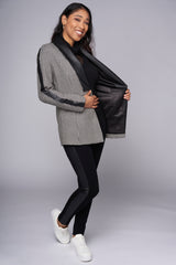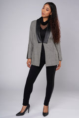 Empiècements linéaires contrastants sur le manches. Coupe ample féminisé du veston masculin. On adore cet ajustement et la tombée du tissu !