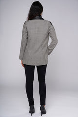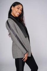 Veston chic en laine avec revers de col en cuir vegan pour un look distingué.
